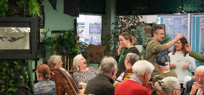 I'm on my way to visit a community project called "The Jungle" and for a moment this doesn’t feel like the place to find it. But as roller shutters rise, like the morning sun, upon a double-width retail unit, here are huge plants, hanging creepers, artificial grass, murals. A frontage that beckons me into another world.